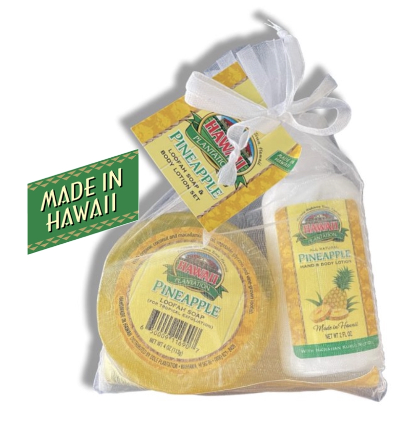 If you’re looking for a great gift to take back home and you don’t want anything perishable, you can’t go wrong with this set of our popular Pineapple Lotion and Loofah Soap. Made in Hawaii. Net Weight 6.5 oz.